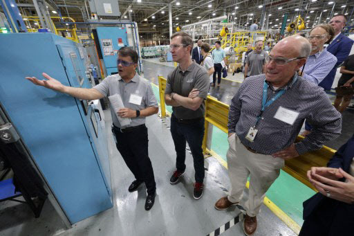 앤디 비셔 켄터키 주지사가 루이빌에 위치한 GE 어플라이언스 세탁기 공장을 시찰하고 있다.(사진=AFP) |