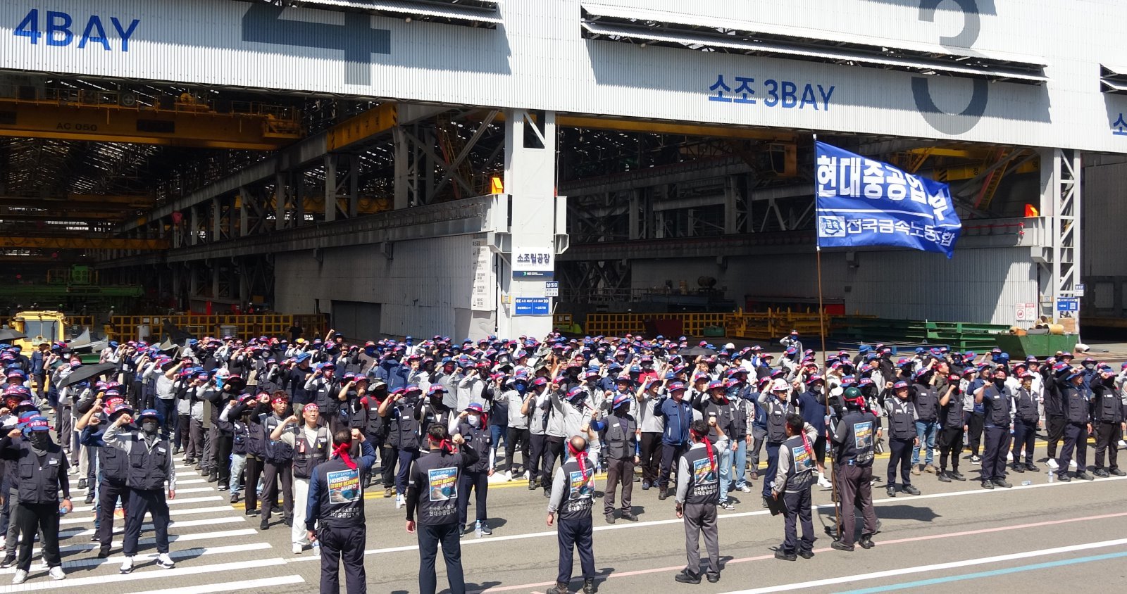 HD현대중공업 노조 조합원들이 29일 울산조선소에서 파업 집회를 하고 있다. 노조는 이날 오후 1시부터 전 조합원 4시간 부분 파업 지침을 내렸다. 금속노조 현대중공업지부 제공 |