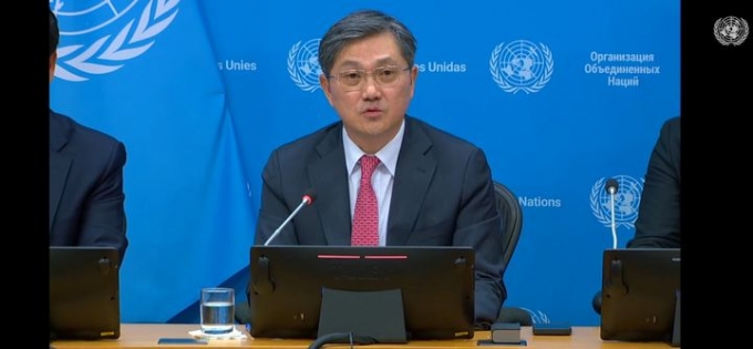 김상진 주유엔대표부 대사대리가 2일(현지시간) 미국 뉴욕 유엔본부에서 한국의 안전보장이사회(안보리) 의장국 수임 및 일정과 관련한 기자회견을 하고 있다. /사진=뉴시스 |