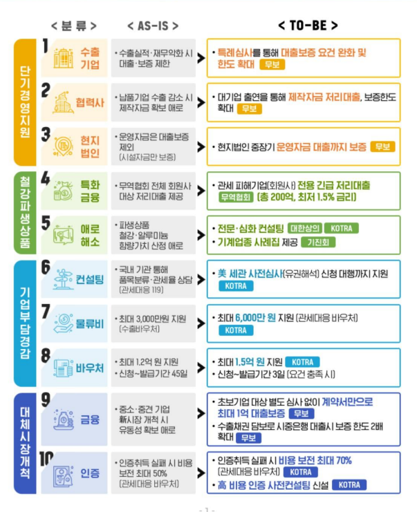 이번 대책은 △美 관세 피해기업 긴급지원 △내수창출 및 국내산업 보호 △글로벌 시장진출 확대 △업종별 수출경쟁력 강화 등을 중심으로 구성됐다.