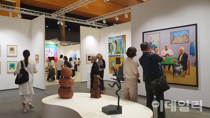지난해 ‘프리즈 서울’ 전경. 갤러리르롱 부스에서 작품을 둘러보던 관람객이 데이비드 호크니의 회화작품 ‘플레이어보다 큰 카드’(A Bigger Card Player, 2015, 오른쪽) 앞에 오래 머물렀다. 올해는 3일 서울 강남구 코엑스에서 ‘키아프 서울 2025’와 ‘프리즈 서울 2025’가 동시에 개막한다. 네 번째 공동개최인 이번 아트페어에는 키아프 175개의 갤러리, 프리즈 120개의 갤러리가 나서 대한민국 최대 미술장터를 연다(사진=오현주 문화전문기자). |