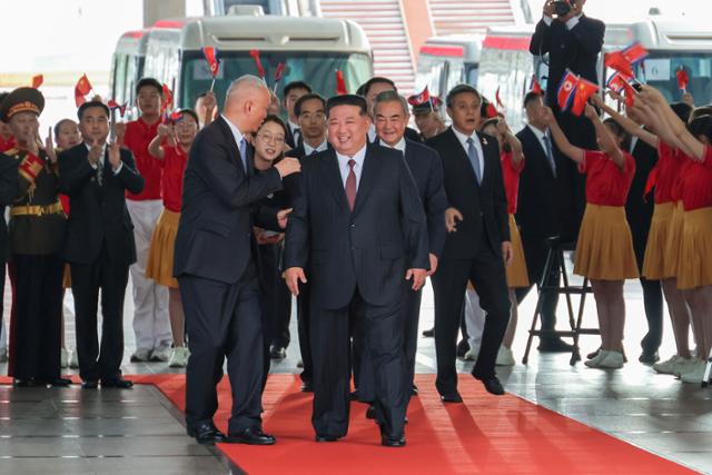 북한 노동신문은 3일 자 1면에 "김 위원장이 2일 오후 '중국인민항일전쟁 및 세계반파시스트전쟁(제2차 세계대전) 승리' 80돌 기념행사에 참석하기 위해 전용열차로 중화인민공화국의 수도 베이징에 도착했다"고 보도했다. 신문은 김 위원장이 딸 주애를 바로 곁에 대동하고 차이치 중국공산당 중앙서기처 서기와 왕이 당 중앙외사판공실 주임(외교부장 겸임) 등의 영접을 받는 사진 등을 실었다. 역사 내부에 김 위원장을 위한 환영 행사가 열린 장면도 함께 담았다.