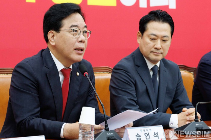 [서울=뉴스핌] 윤창빈 기자 = 송언석 국민의힘 원내대표가 3일 오전 서울 여의도 국회에서 열린 긴급 최고위원회의에서 모두발언을 하고 있다. 2025.09.03 pangbin@newspim.com