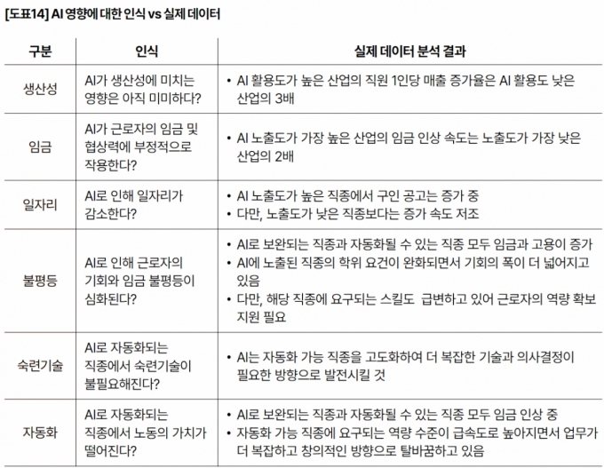 이어 보고서는 AI 노출도가 높은 직종에서 오히려 고용이 증가할 수 있으며 AI 자체가 위협이 되기보다 AI를 활용하는 인력이 노동시장 수요를 독차지할 가능성이 높다고 말했다. AI 노출도는 해당 업무를 수행할 때 AI 기술이 얼마나 활용 가능한지 나타내는 지표로, 일반적으로 고학력이나 전문 자격이 요구되는 직업군에서 AI 노출도가 높게 나타났다.