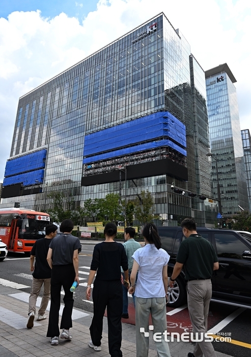 KT 광화문 웨스트 사옥이 4년 간의 리모델링을 맞추고 8월 20일 사업부별로 순차 입주를 시작한다. 이날을 시작으로 순차 입주를 시작한 웨스트 사옥은 9월 공식개관한다. 서울 종로구 KT 광화문 웨스트 사옥 외벽에 막바지 디지털 사이니지 설치 작업이 한창이다. 이동근기자 foto@etnews.com |