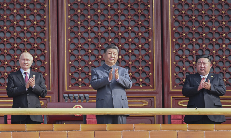 블라디미르 푸틴 러시아 대통령(왼쪽부터)과 시진핑 중국 국가주석, 김정은 조선노동당 총비서 겸 국무위원장이 3일 오전 중국 베이징 천안문 망루에 나란히 서서 ‘중국 인민 항일전쟁 및 반파시스트전쟁 승리 80주년 경축행사’ 열병식을 보며 손뼉을 치고 있다. 베이징/신화 연합뉴스 |
