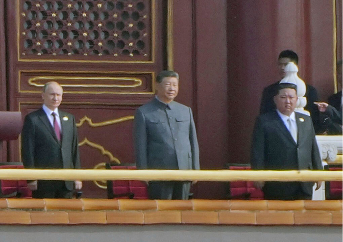 시진핑 국가주석의 왼쪽에 김정은 위원장, 오른쪽에 푸틴 대통령이 나란히 자리한 모습은 이날 관영 중국중앙(CC)TV 등을 통해 전 세계에 생중계됐다.