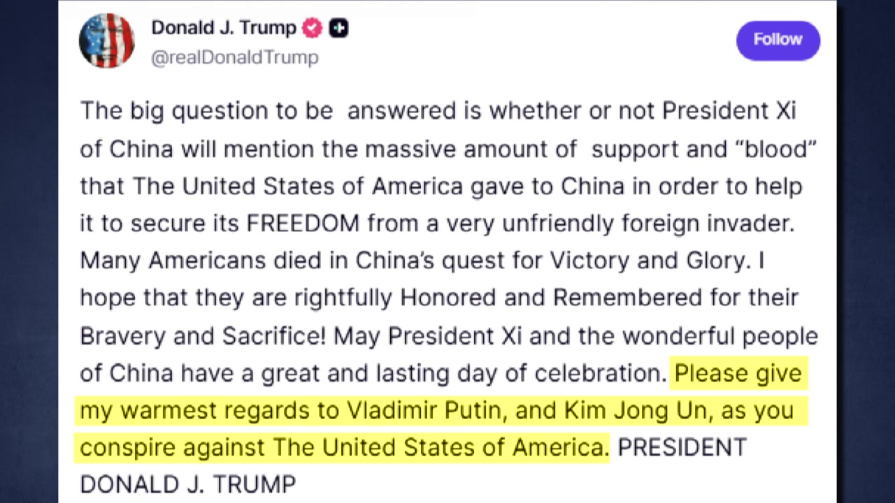 트럼프 대통령은 소셜미디어에 올린 글에서 "중국이 매우 적대적인 외국 침략자를 상대로 자유를 확보하도록 도울 목적으로 미국이 중국에 제공한 막대한 양의 지원과 '피'를 중국 시진핑 주석이 언급할지가 답변돼야 할 중대한 문제"라고 말했습니다.