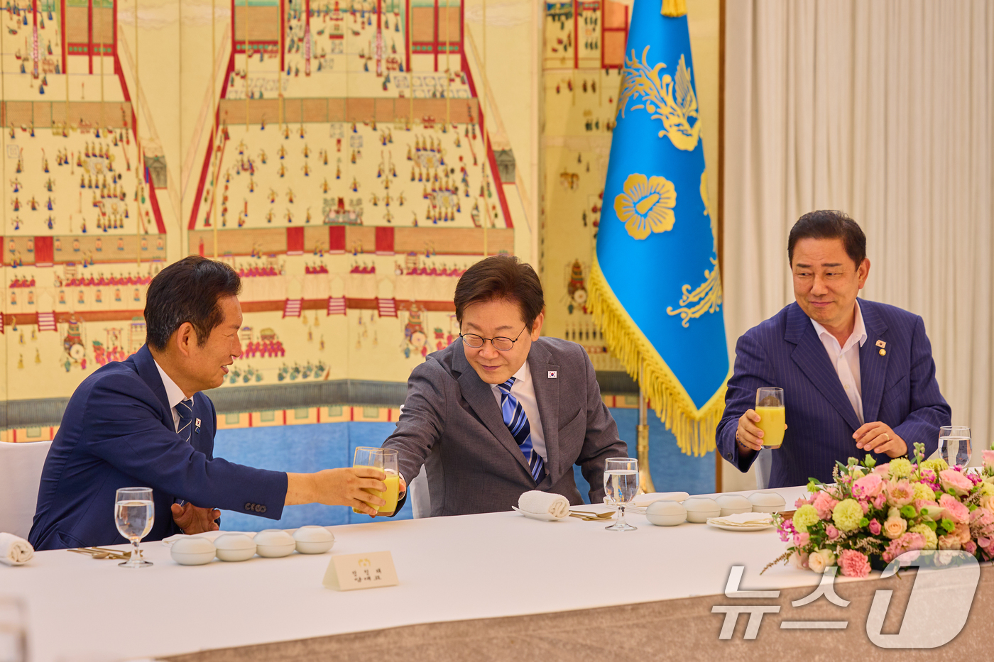 이재명 대통령이 지난 달 20일 서울 한남동 관저에서 정청래 대표, 김병기 원내대표 등 더불어민주당 신임 지도부와 가진 만찬에서 건배하고 있다. (대통령실 제공. 재판매 및 DB 금지) 2025.8.20/뉴스1 ⓒ News1 허경 기자 |
