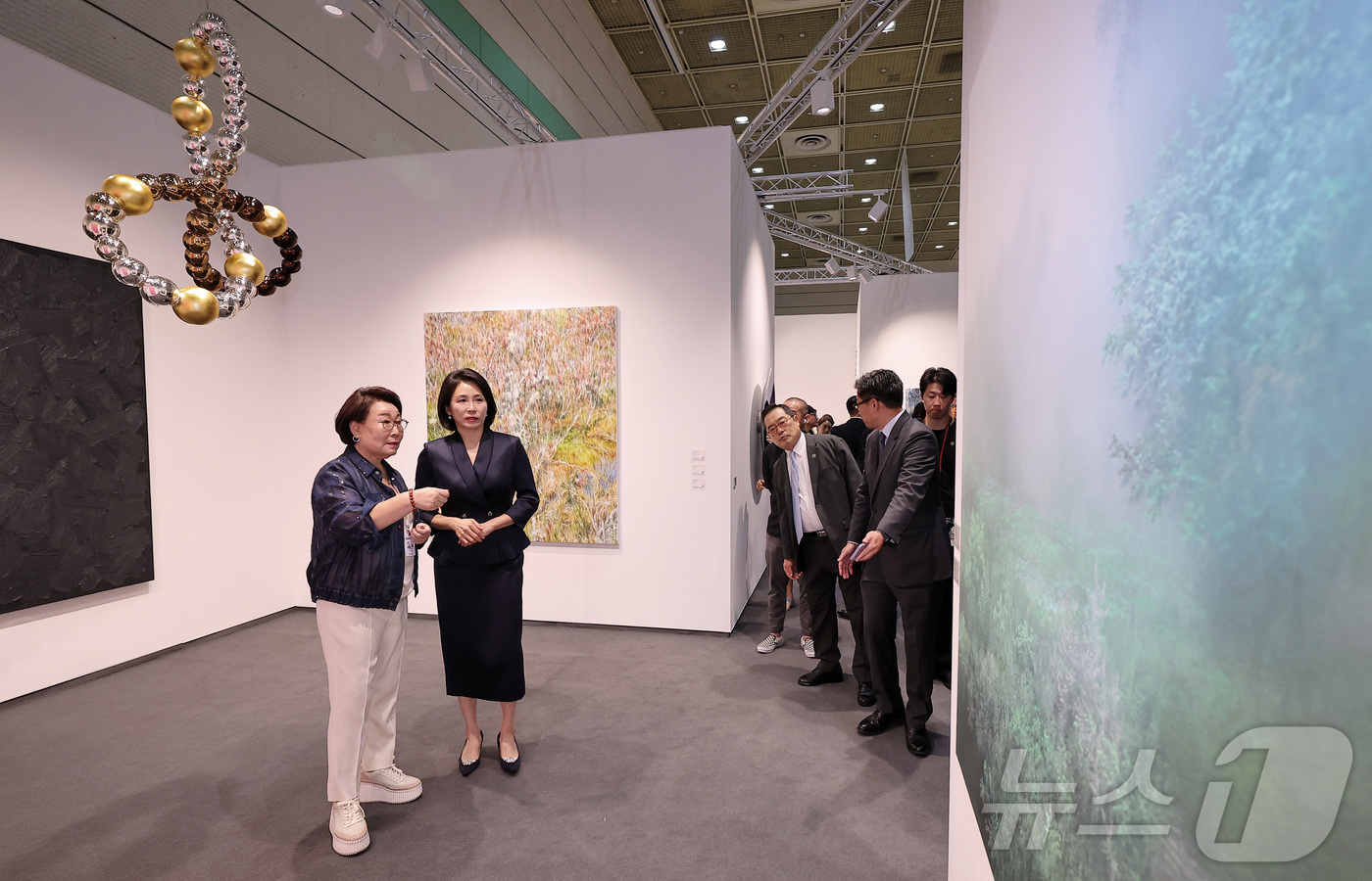 (서울=뉴스1) 김성진 기자 = 이재명 대통령의 부인 김혜경 여사가 3일 서울 강남구 코엑스에서 열린 '프리즈 서울 2025' VIP 프리뷰 데이를 찾아 작품들을 관람하고 있다. 2025.9.3/뉴스1