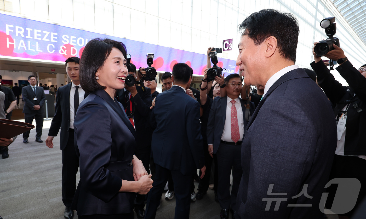 (서울=뉴스1) 김성진 기자 = 이재명 대통령의 부인 김혜경 여사와 오세훈 서울시장이 3일 서울 강남구 코엑스에서 열린 '프리즈 서울 2025' VIP 프리뷰 데이에서 인사를 하고 있다. 2025.9.3/뉴스1