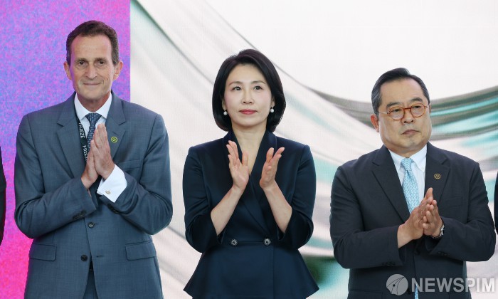 [서울=뉴스핌] 정일구 기자 = 이재명 대통령 부인 김혜경 여사(가운데)와 구자열 키아프 조직위원장(오른쪽), 사이먼 폭스 프리즈 CEO가 3일 오전 서울 강남구 코엑스에서 열린 '키아프·프리즈 서울 2025' 포토콜 행사에서 박수치고 있다. 2025.09.03 mironj19@newspim.com