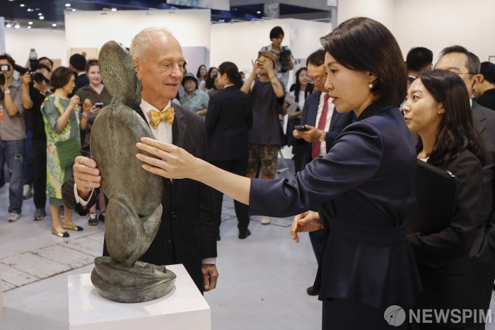 [서울=뉴스핌] 정일구 기자 = 이재명 대통령 부인 김혜경 여사가 3일 오전 서울 강남구 코엑스에서 열린 '키아프 서울 2025' 페어 투어 행사에서 전시 작품들을 관람하고 있다. 2025.09.03 mironj19@newspim.com