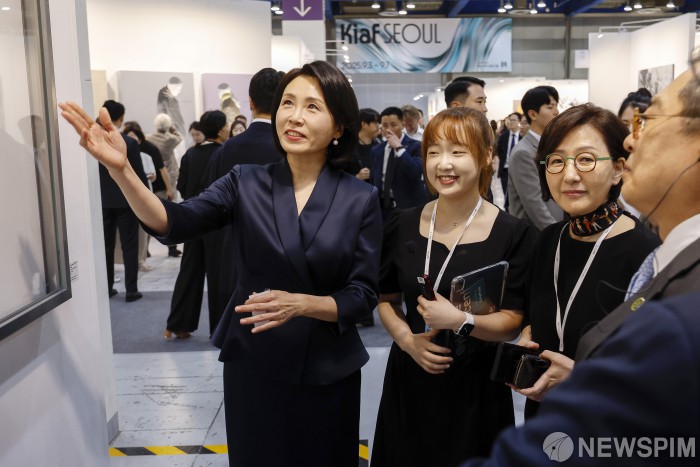 [서울=뉴스핌] 정일구 기자 = 이재명 대통령 부인 김혜경 여사가 3일 오전 서울 강남구 코엑스에서 열린 '키아프 서울 2025' 페어 투어 행사에서 전시 작품들을 관람하고 있다. 2025.09.03 mironj19@newspim.com
