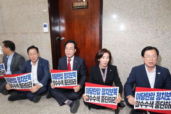송언석 국민의힘 원내대표, 나경원 의원 등이 3일 서울 여의도 국회 원내대표실 앞에서 '야당탄압 정치보복 압수수색 중단하라'라고 적힌 손팻말을 들고 농성을 하고 있다. 연합뉴스 |