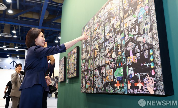 [서울=뉴스핌] 정일구 기자 = 이재명 대통령 부인 김혜경 여사가 3일 오전 서울 강남구 코엑스에서 열린 '키아프 서울 2025' 페어 투어 행사에서 전시 작품들을 관람하고 있다. 2025.09.03 mironj19@newspim.com