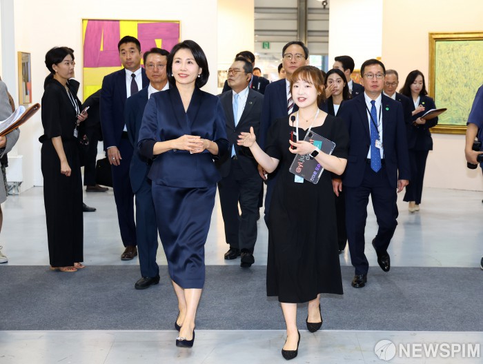 [서울=뉴스핌] 정일구 기자 = 이재명 대통령 부인 김혜경 여사가 3일 오전 서울 강남구 코엑스에서 열린 '키아프 서울 2025' 페어 투어 행사에서 전시 작품들을 관람하고 있다. 2025.09.03 mironj19@newspim.com