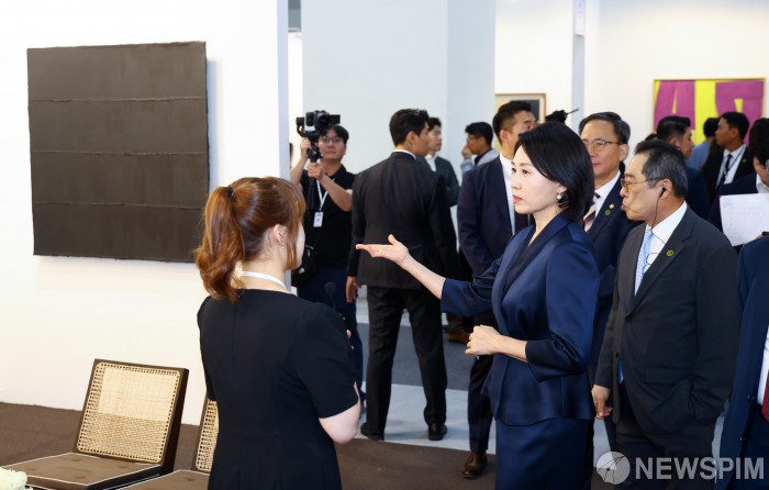 [서울=뉴스핌] 정일구 기자 = 이재명 대통령 부인 김혜경 여사가 3일 오전 서울 강남구 코엑스에서 열린 '키아프 서울 2025' 페어 투어 행사에서 전시 작품들을 관람하고 있다. 2025.09.03 mironj19@newspim.com