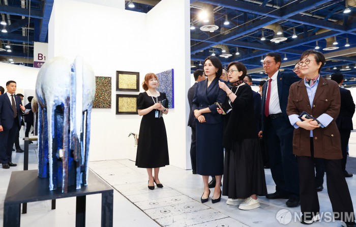 [서울=뉴스핌] 정일구 기자 = 이재명 대통령 부인 김혜경 여사가 3일 오전 서울 강남구 코엑스에서 열린 '키아프 서울 2025' 페어 투어 행사에서 전시 작품들을 관람하고 있다. 2025.09.03 mironj19@newspim.com