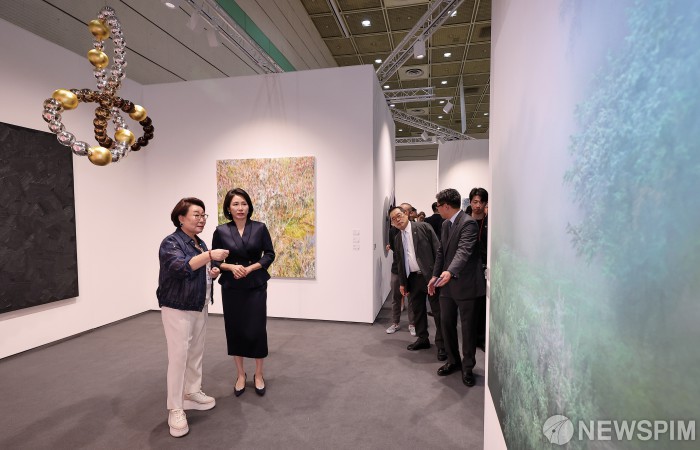 [서울=뉴스핌] 정일구 기자 = 이재명 대통령 부인 김혜경 여사가 3일 오전 서울 강남구 코엑스에서 열린 '프리즈 서울 2025' 페어 투어 행사에서 전시 작품들을 관람하고 있다. 2025.09.03 mironj19@newspim.com