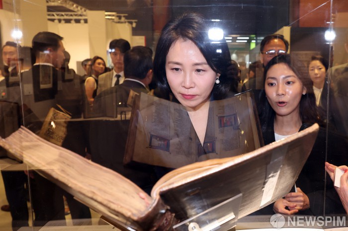[서울=뉴스핌] 정일구 기자 = 이재명 대통령 부인 김혜경 여사가 3일 오전 서울 강남구 코엑스에서 열린 '프리즈 서울 2025' 페어 투어 행사에서 전시 작품들을 관람하고 있다. 2025.09.03 mironj19@newspim.com