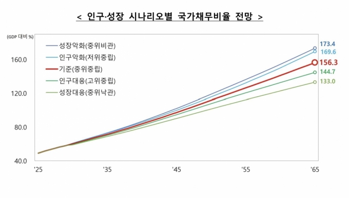 이번 전망은 통계청 인구추계와 KDI 거시경제전망을 기초로 인구·성장률 변동에 따라 다섯 가지 시나리오를 제시했다. 인구를 중위로 가정할 경우 성장 낙관 시 채무비율은 133.0%지만 성장 비관 시 173.4%까지 치솟는다. 성장을 중립으로 가정하면 인구 고위 시는 144.7%, 인구 저위 시는 169.6%다.