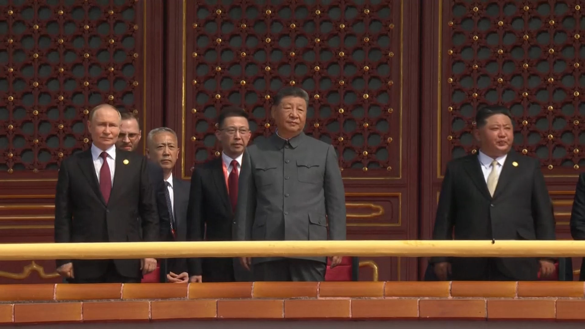 화기애애하게 담소를 나누며 나란히 톈안먼 망루에 오른 북·중·러 정상.