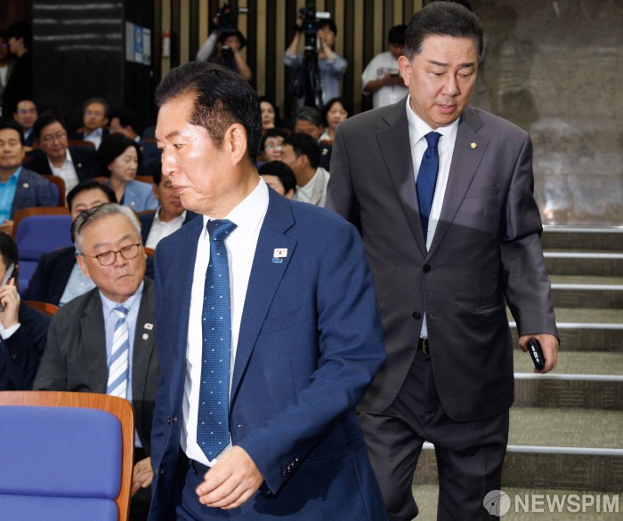 [서울=뉴스핌] 윤창빈 기자 = 정청래 더불어민주당 대표, 김병기 원내대표가 3일 오후 서울 여의도 국회에서 열린 정책의원총회에 참석하고 있다. 2025.09.03 pangbin@newspim.com |