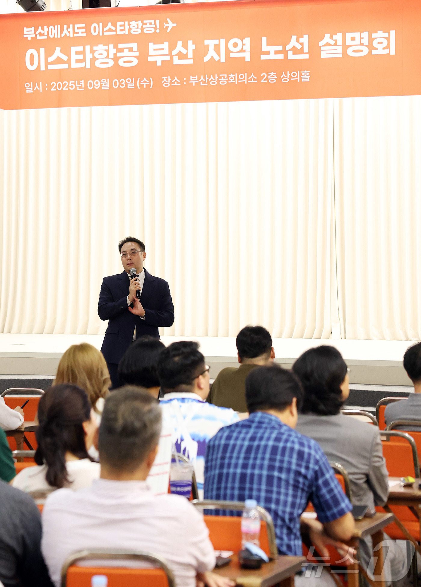 (김해공항=뉴스1) 공항사진기자단 = 이경민 이스타항공 커머셜본부장이 3일 부산 상공회의소에서 '부산에서도 이스타항공!' 노선 설명회를 갖고 있다. 이 본부장은 부울경 지역 여행사 임직원 약 80명을 대상으로 현재 부산에서 운항하고 있는 이스타항공의 노선 소개와 함께 오는 10월 26일부터 운항하는 신규 취항지, 운영 전략에 대해 설명했다. 2025.9.3/뉴스1