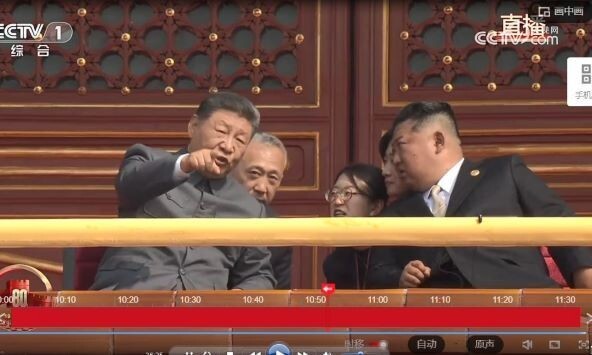 김정은 북한 국무위원장(오른쪽)과 시진핑 중국 국가주석이 3일 중국 전승절 80돌 경축 열병식 도중 천안문 망루에 나란히 앉아 이야기를 나누고 있다. 중국중앙텔레비전(CCTV) 화면 촬영 |