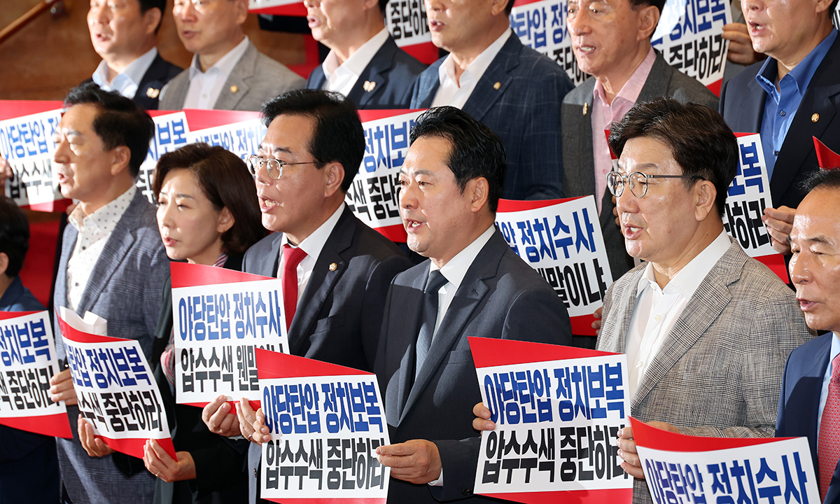 송언석 원내대표 역시 “(압수수색) 영장에 따르면 추경호 원내대표가 당선되던 2024년 5월부터 영장을 집행하는 오늘까지 모든 것을 압수수색 기간으로 했다”며 “추 전 원내대표가 무슨 신통력이 있어서 비상계엄 6개월 전부터 계엄을 예상하고, 표결 방해 행위를 미리 준비했다고 생각하는 것이냐”고 질타했다.