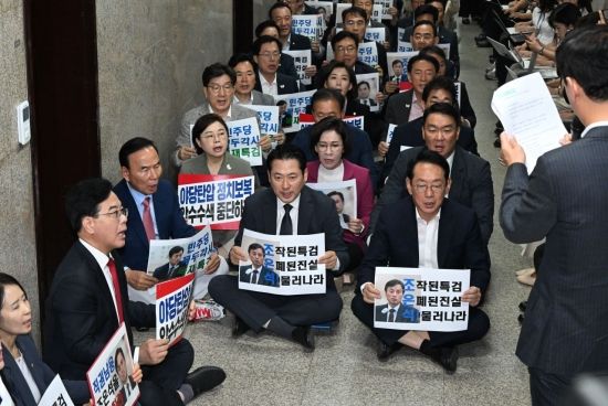 국민의힘 의원들은 이날 오후 국회 본관 원내대표실과 원내행정국 앞 복도 바닥에 앉아 압수수색 집행에 나선 특검팀과 대치했다. 장동혁 대표를 비롯한 지도부와 다수 의원은 특검팀을 향해 "정치보복 특검 해체하라" 등의 구호를 외치며 강하게 반발했다.