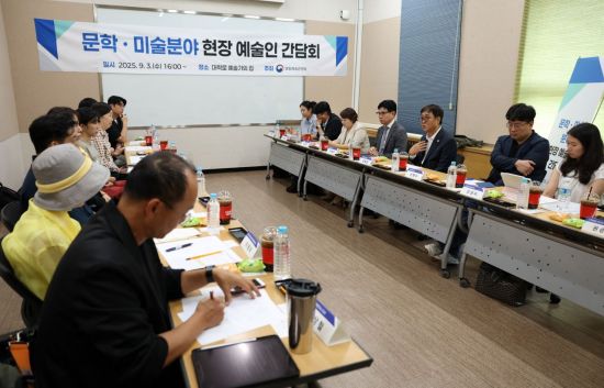 최휘영 문화체육관광부 장관이 3일 서울 종로구 예술가의집에서 문학·미술분야 현장 예술인을 만나 현장 의견을 수렴하고 있다. [사진 제공= 문화체육관광부] |