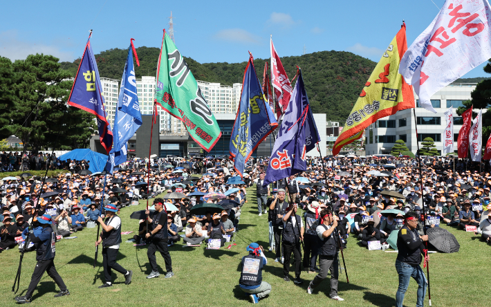 9월 3일 울산 북구 현대자동차 울산공장 본관 앞에서 현대차 노조의 총파업 결의대회가 열렸다. 연합뉴스 |