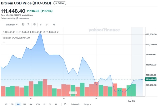 비트코인 가격 차트, 자료=야후 파이낸스, 2025.09.03 koinwon@newspim.com |