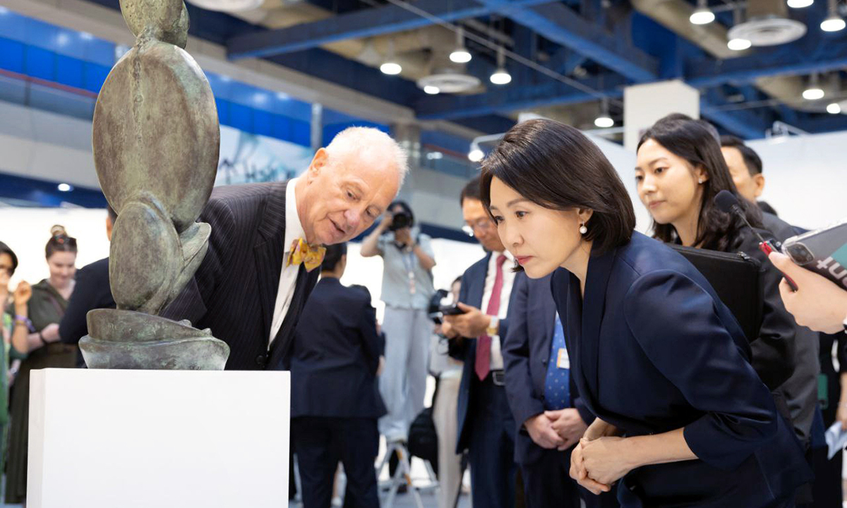 이재명 대통령의 배우자인 김혜경 여사(오른쪽)가 3일 서울 강남구 코엑스에서 열린 ‘키아프·프리즈 서울 2025’ 개막식에 참석해 전시품을 살펴보고 있다. 김 여사는 이날 행사를 관람하며 “한국적인 멋이 녹아들어 있는 작품도 많다. 가장 한국적인 것이 가장 세계적인 것”이라고 평가했고 국내 미술시장 성장 방안 등에 대한 의견도 청취했다.