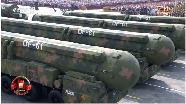 마지막 순서인 전략 작전군 부대 행렬 가운데에선 이날 최초로 모습을 드러낸 DF-61 미사일이 포착됐다. 둥펑(DF) 계열 대륙간탄도미사일 DF-41의 개량형으로 추정된 DF-61는 미국 본토 타격이 가능한 최신형 무기로 알려졌다. 이보다 사거리가 긴 대륙간 전략핵미사일 DF-5C도 공개됐다. 중국중앙TV(CCTV)는 DF-61이 속한 전략 작전군의 '핵미사일 1, 2 방대'를 소개하며 "최초로 육해공 삼위일체 전략 핵역량을 집중 전시했으며 타격 범위는 전 지구를 아우른다"고 했다.
