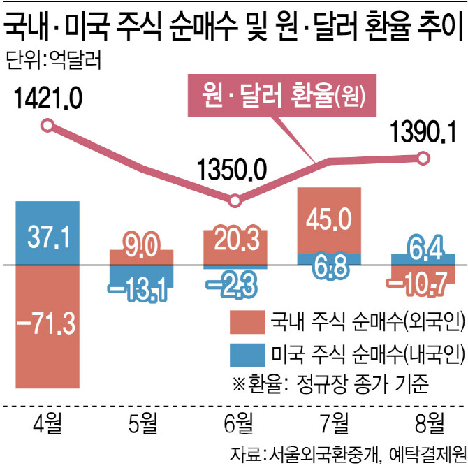 달러가 유출되자 환율은 상승했다. 정규장 종가 기준으로 환율은 4월 1421.0원에서 △5월(1380.1원) △6월(1350.0원) △7월(1387.0원)까지 1300원 중반대로 하락하다 8월에는 다시 1390.1원으로 올라서며 1400원에서 가까워졌다.