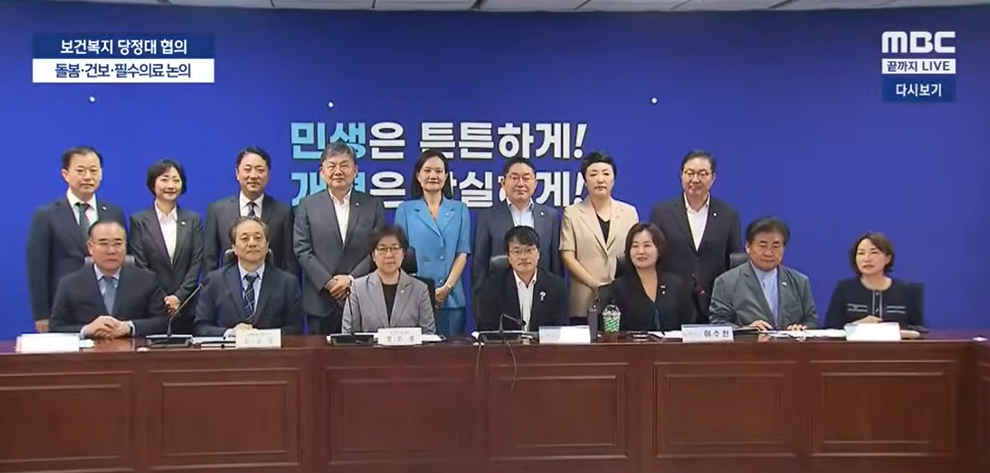 4일 국회 의원회관에서 열린 보건복지 분야 관련 당·정·대협의회에서 참석자들이 기념 촬영을 하고 있다. [MBC뉴스 유튜브 채널 캡처] |
