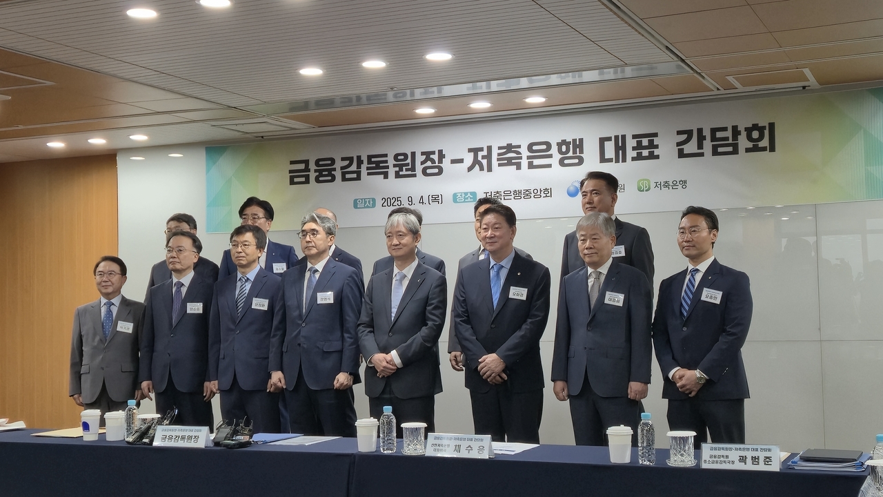 이찬진(앞줄 왼쪽 다섯번째) 금융감독원장이 4일 서울 마포구 저축은행중앙회에서 오화경(앞줄 왼쪽 여섯번째) 저축은행중앙회장과 11개 저축은행 CEO와 간담회를 갖고 서민과 중소기업 소비자 보호에 만전을 기해달라고 주문했다. 박성준 기자 |