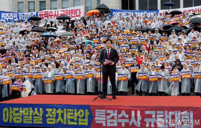 [서울=뉴스핌] 윤창빈 기자 =송언석 국민의힘 원내대표가 4일 오전 서울 여의도 국회에서 열린 야당말살 정치탄압 특검수사 규탄대회에서 규탄사를 하고 있다. 2025.09.04 pangbin@newspim.com