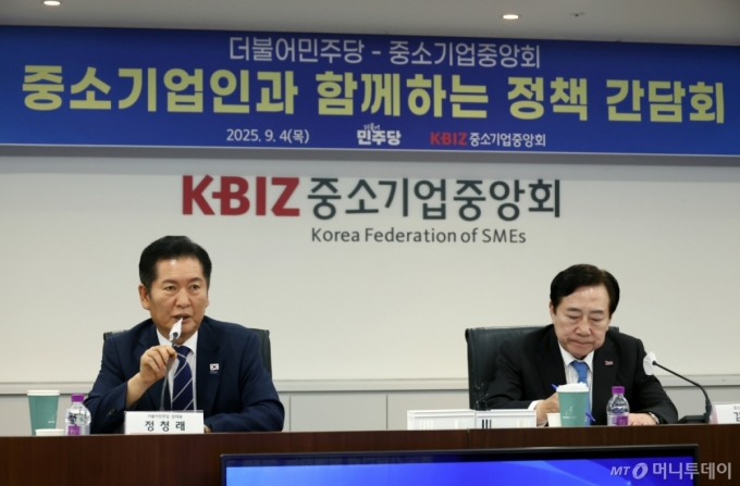 [서울=뉴시스] 고승민 기자 = 정청래 더불어민주당 대표가 4일 서울 여의도 중소기업중앙회에서 열린 더불어민주당-중소기업중앙회 중소기업인과 함께하는 정책간담회에서 인사말을 하고 있다. 2025.09.04. kkssmm99@newsis.com /사진=고승민 |