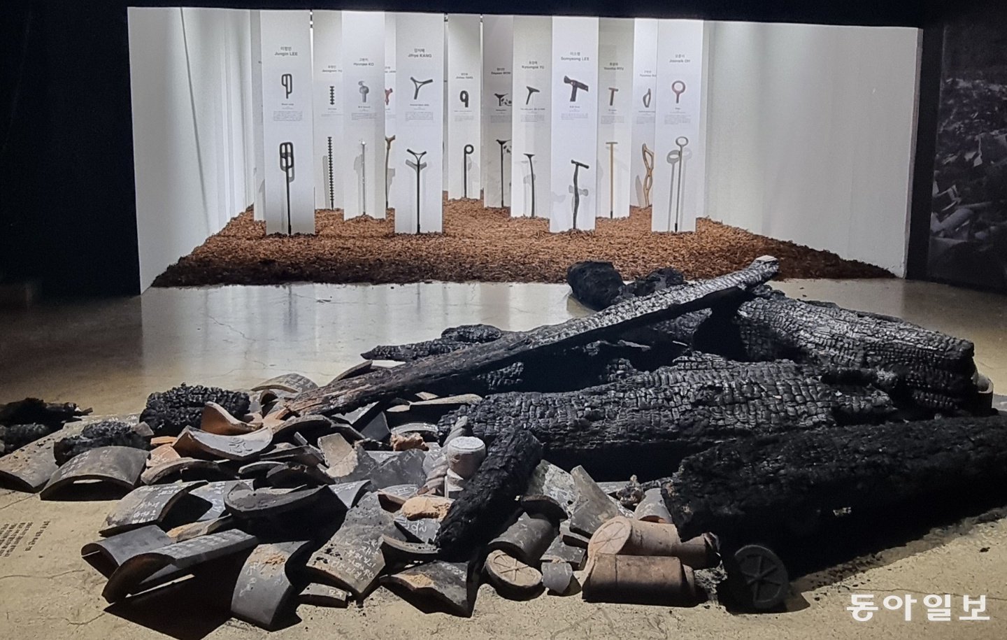 청주공예비엔날레에 전시된, 올해 경북 산불로 전소된 고운사의 잔해와 그 나무들로 제작한 지팡이 작품. 장기우 기자 straw825@donga.com |