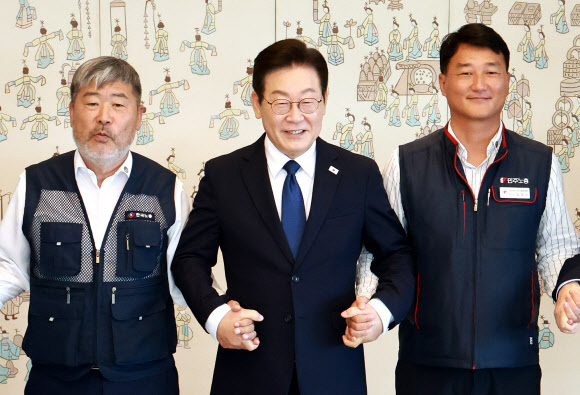 이재명 대통령이 4일 서울 용산 대통령실 청사에서 열린 양대 노총 위원장과 오찬 간담회에서 양경수(오른쪽) 민주노총 위원장, 김동명 한국노총 위원장과 기념촬영을 하고 있다. 대통령실통신사진기자단 |