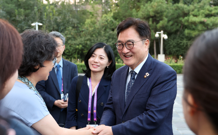 우 의장은 김정은 위원장도 만나 악수와 함께 짧은 인사를 건넸는데, 국민의힘이 이를 문제 삼은 것이다.