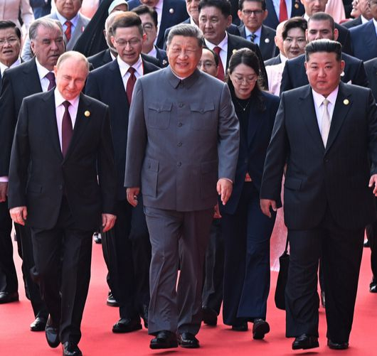 지난 3일 중국의 전승 80주년을 기념하는 열병식 참관을 위해 26개국 정상들이 베이징의 천안문 망루로 이동하고 있다. 맨 앞줄에서 블라디미르 푸틴 러시아 대통령(왼쪽부터), 시진핑 중국 국가주석, 김정은 북한 국무위원장이 나란히 걸어가고 있다. 3국 정상이 한자리에 모인 건 1959년 10월 신중국 건국 10주년 열병식 이후 66년 만이다. 신화=연합뉴스 |