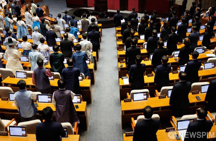 [서울=뉴스핌] 윤창빈 기자 = 1일 오후 서울 여의도 국회에서 열린 제429회국회(정기회) 개회식에서 의원들이 국민의례를 하고 있다. 이날 우원식 국회의장 및 더불어민주당은 한복을, 국민의힘은 상복을 입고 참석했다. 2025.09.01 pangbin@newspim.com |