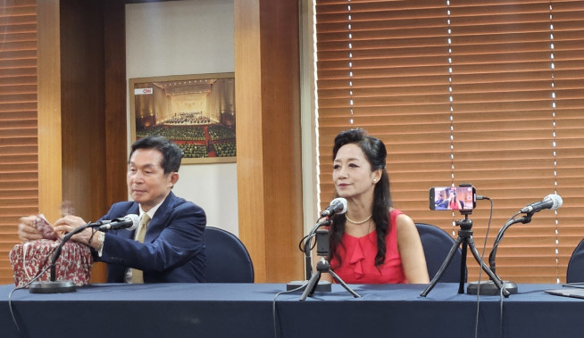 4일 서울 프레스센터에서 열린 '더 라스트 퀸' 기자회견에서 발언 중인 전월선(오른쪽) 소프라노와 김덕길 카네다 홀딩스 회장. |