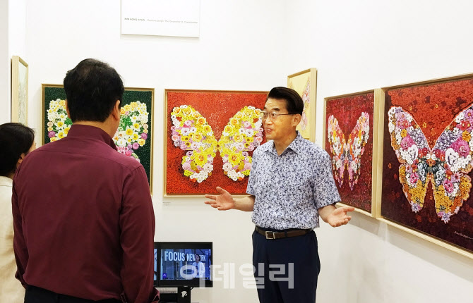 [이데일리 김태형 기자] 나비작가 김홍년 작가가 3일 KIAF 2025 VIP 프리뷰에서 관람객들에게 자신의 작품을 소개하고 있다.