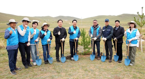(무안=연합뉴스) 형민우 기자 = 전남도는 4일 몽골 울란바토르 테를지 국립공원의 한-몽 그린벨트 사업지구에서 몽골 산림청과 함께 기후위기 대응을 위한 우호의 숲 조성 행사를 열었다.